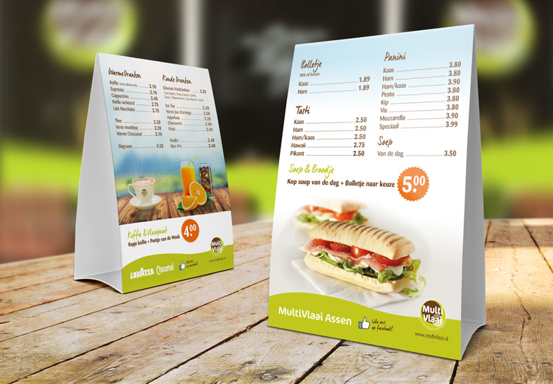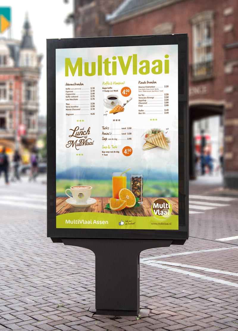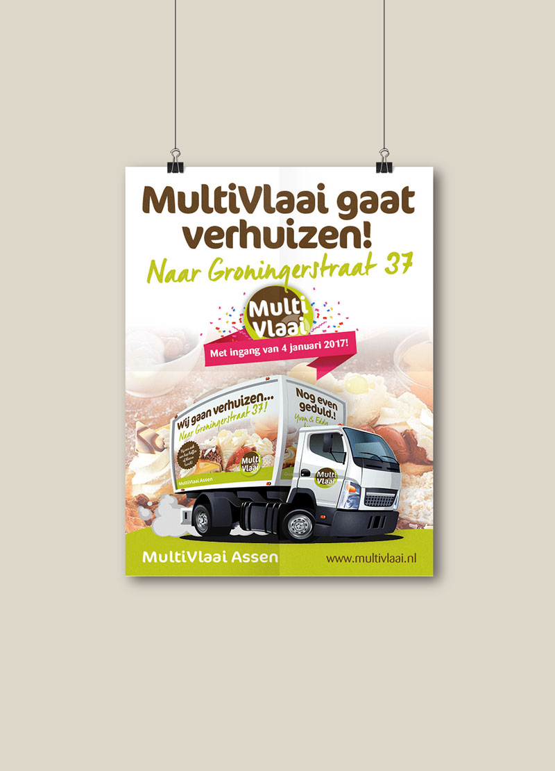 Multivlaai Assen gaat verhuizen naar een nieuwe locatie. De winkel krijgt een make-over en daar hoort nieuw drukwerk bij. Flyer, Posters en menukaarten voor Multivlaai. In de Multivlaai huisstijl!